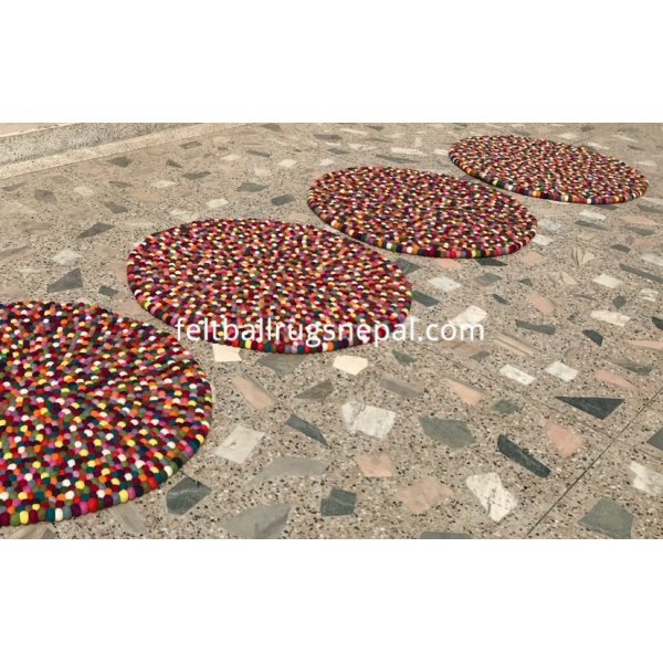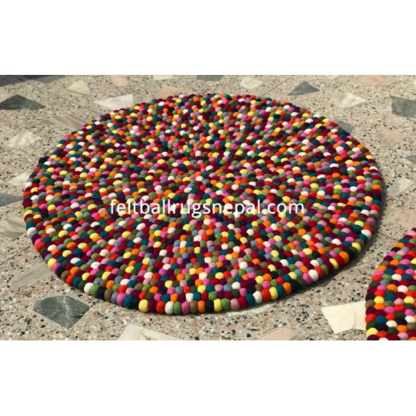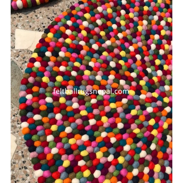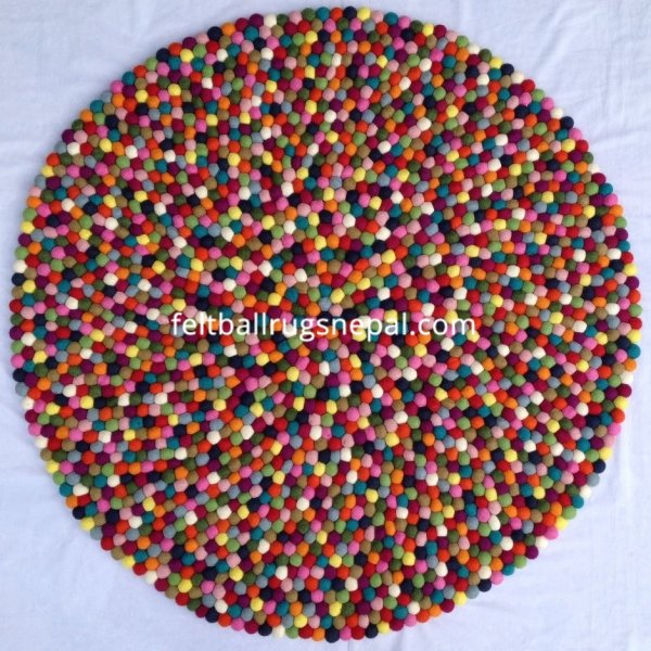 The multi colored felt ball rug has 15 different colors and is handmade by Nepalese women.The most popular felt ball rug is round and comes in any size from 90 to 300 cm in diameter. It’s a bright centre piece in any room. The rug can be custom made in your own choice of colors.